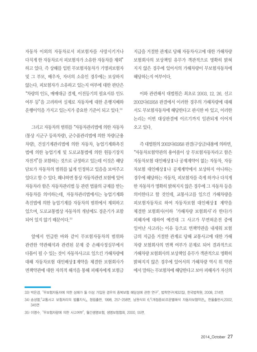 컬럼/논문 월간 손해보험 2014년 10월호 발췌 _ 무보험자동차상해담보에서 무보험자동차의 범위 및 구상권 행사와 관련된 문제점 고찰