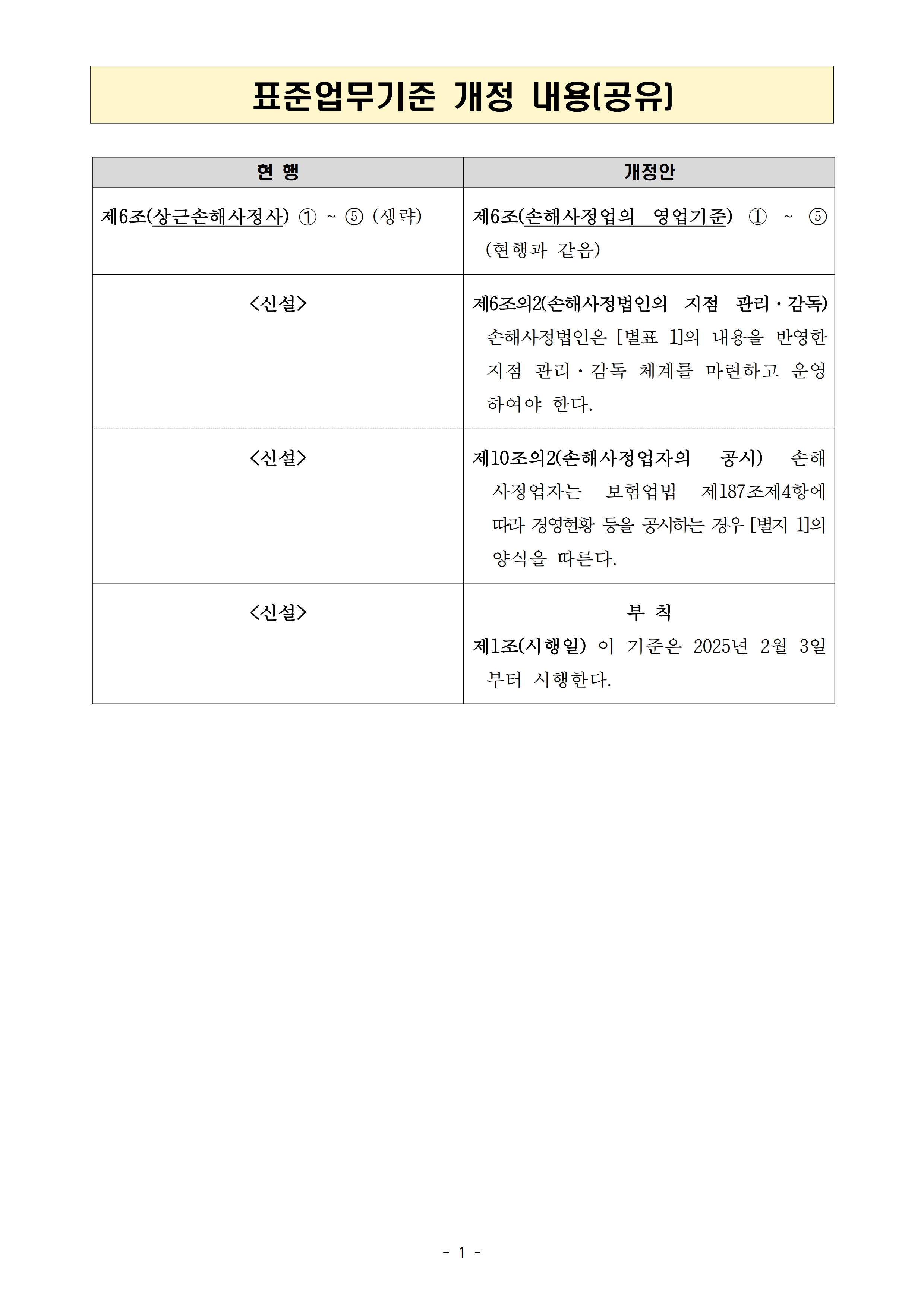 1. 「손해사정사 및 손해사정업자 표준업무기준」 개정 주요 내용.hwp